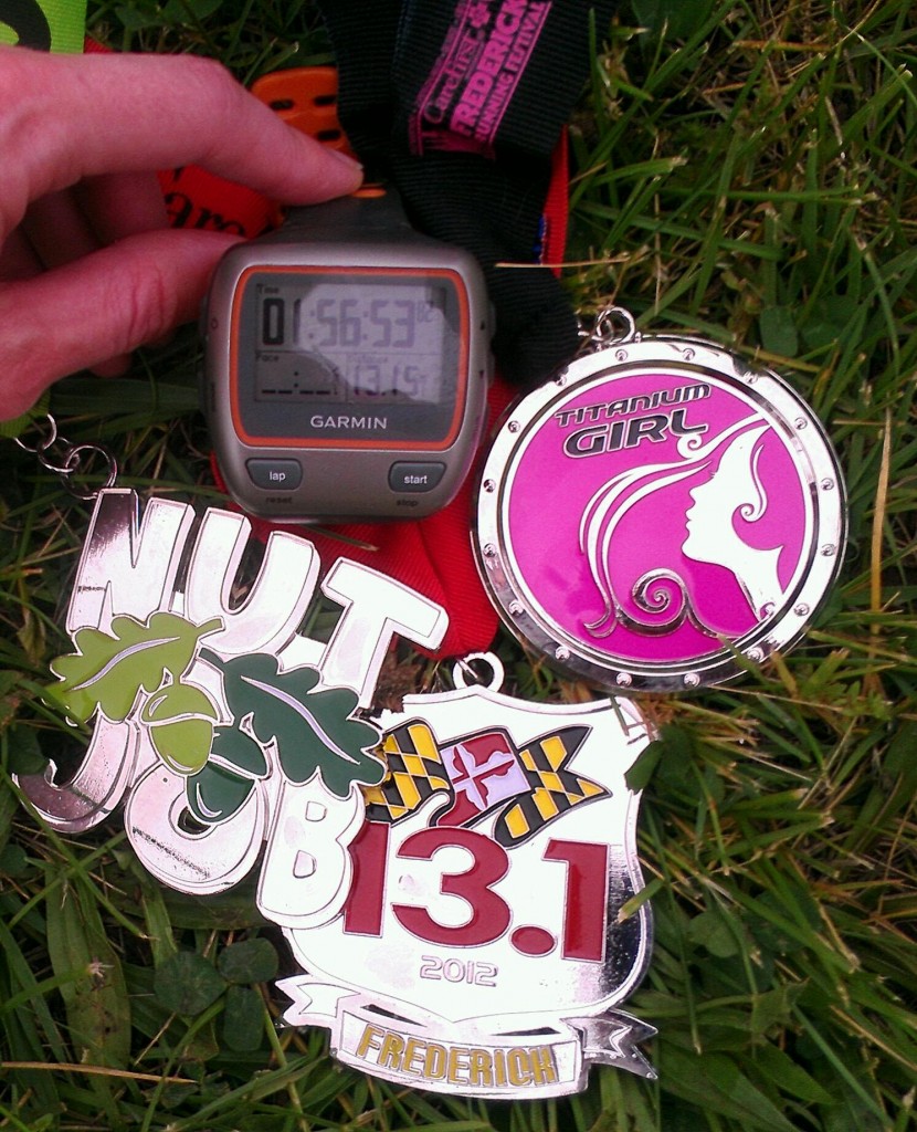 The Frederick race partnered with Iron Girl to give a “Titanium Girl” medal to runners that ran both half marathons. So with the “Nut Job,” I got a lot of bling!