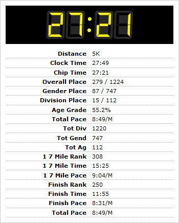 I figured I’d run the 5K easy. I even turned off the pace screen on my Garmin so I couldn’t be influenced by it. Well, the course was pretty flat, and I felt good! I was expecting something in the 30-minute range, but my legs thought otherwise.